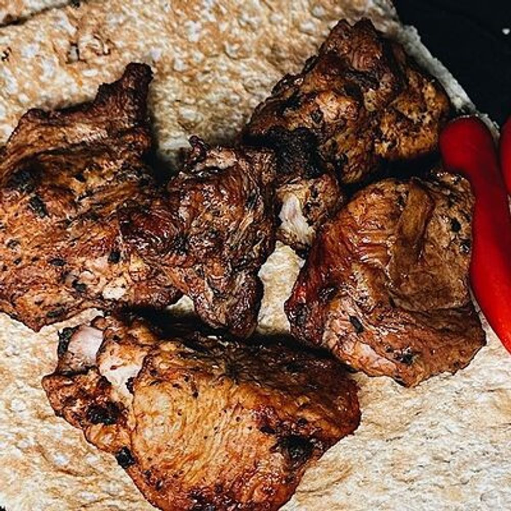 Ароматная румяная свиная шея, приготовленная по фирменному рецепту. Подается с маринованным луком, жареным лавашом
