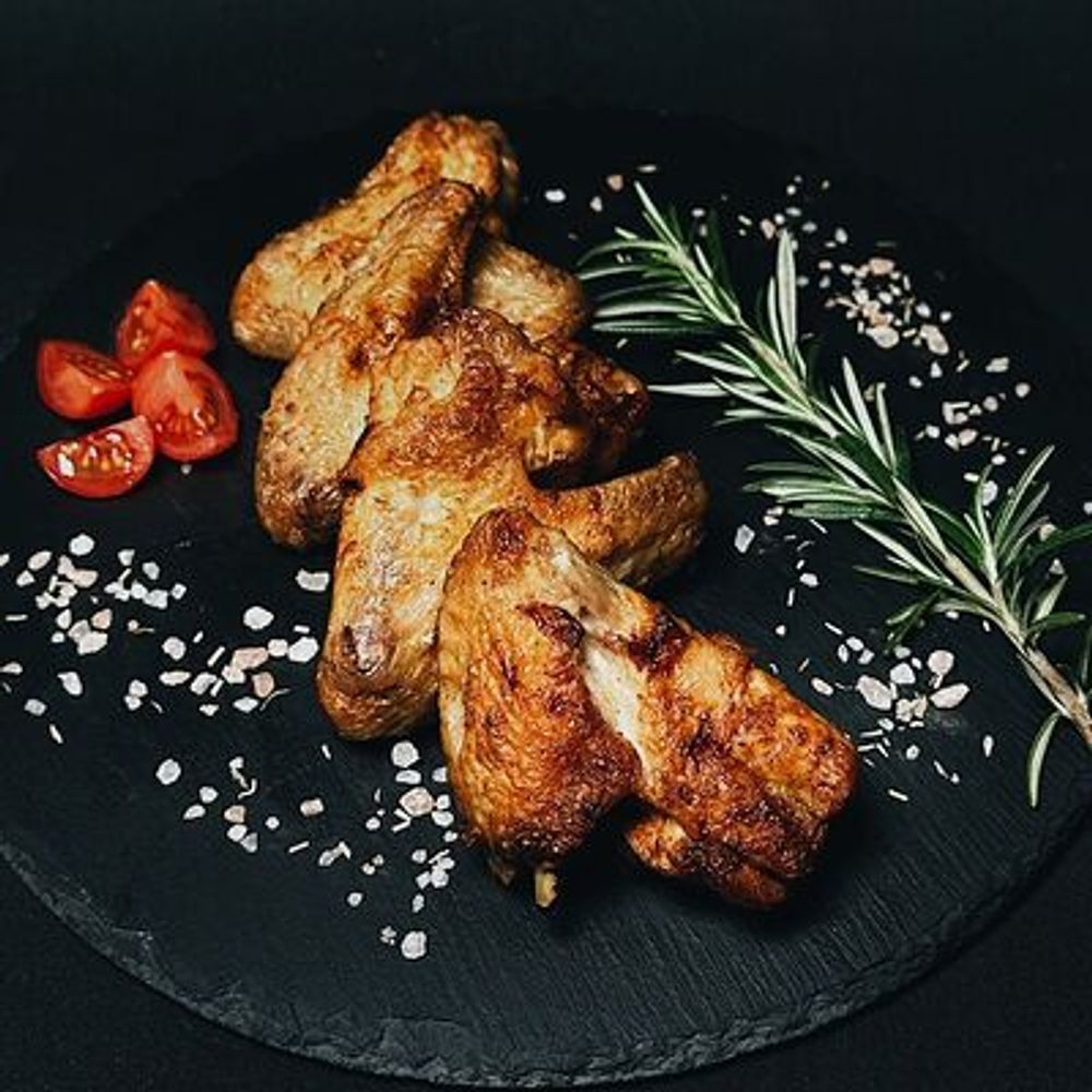 Крупные ароматные куриные крылышки, маринованные в пряностях, обжаренные на мангале до хрустящей корочки