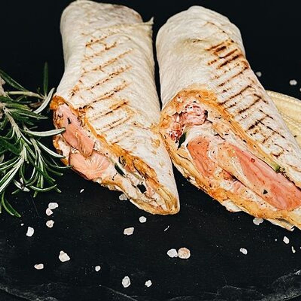 Блюдо из армянского лаваша, начиненное салатом из капусты, огурцов, томатов, двумя сосисками на гриле под фирменными чесночным и томатным соусами