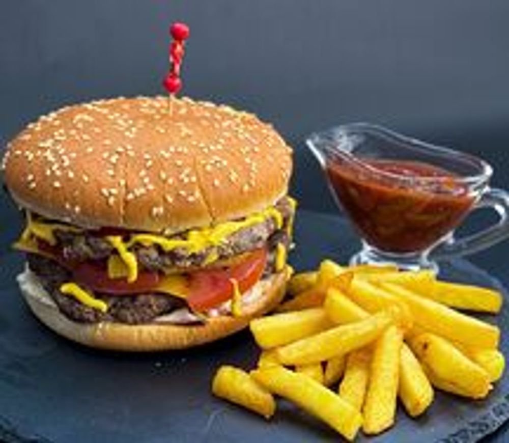 Румяная булочка с кунжутом, начиненная ломтиками свежего томата, огурчика, латуком, 2-мя говяжьими котлетами под топленым ломтиком сыра в сочетании с фирменными соусами